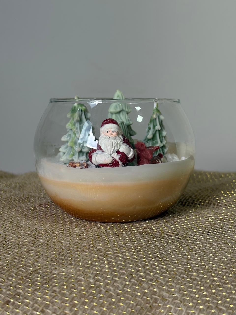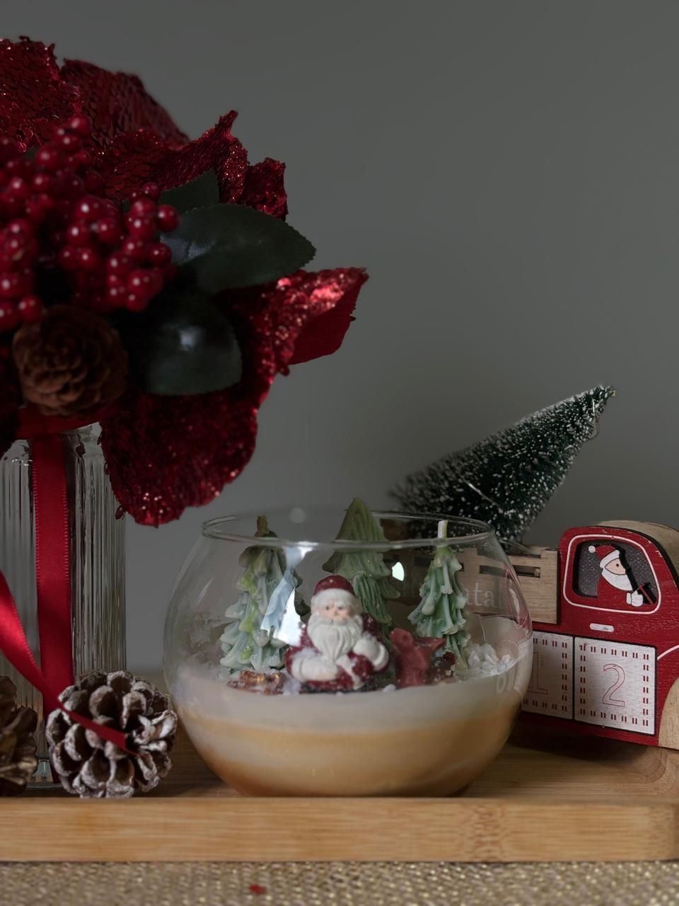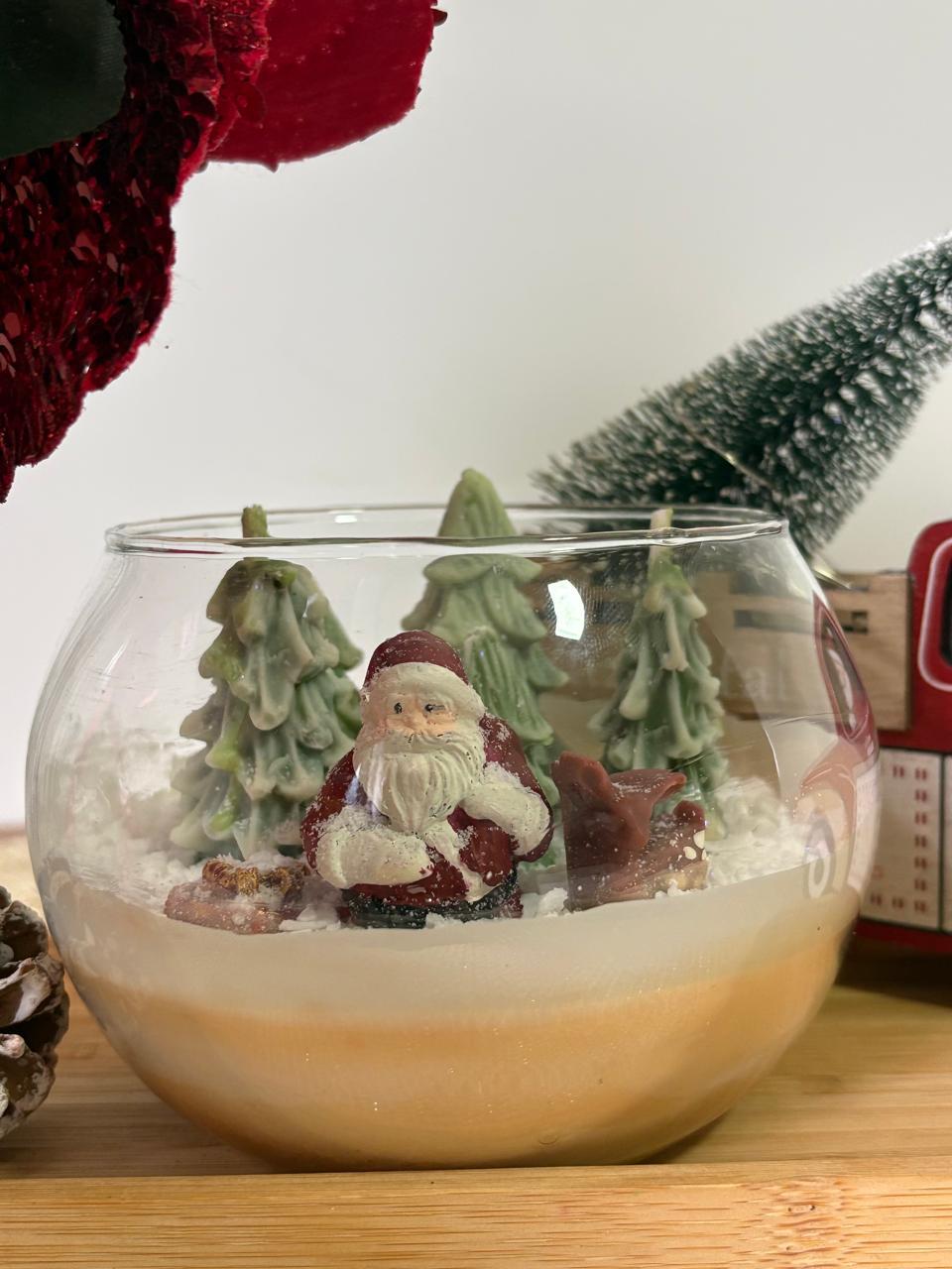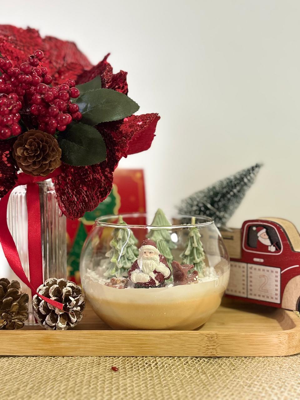 Uma vela artesanal premium, criada com alma, com cenário natalino em miniatura composto por Papai Noel, pinheiros nevados e um cervo, montados dentro de um aquário de vidro redondo com brilho. A peça cria um efeito de “mini vila de Natal” aconchegante e sofisticada, perfeita para decorar ambientes, presentear e compor mesas temáticas.